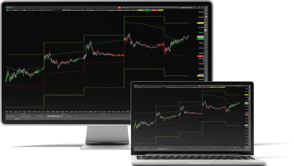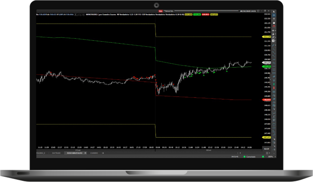 O MINOTAURO transforma o gráfico em um guia visual, permitindo identificar com precisão os melhores pontos de entrada e saída por meio de seus sinais em forma de setas verdes, vermelhas e amarelas.