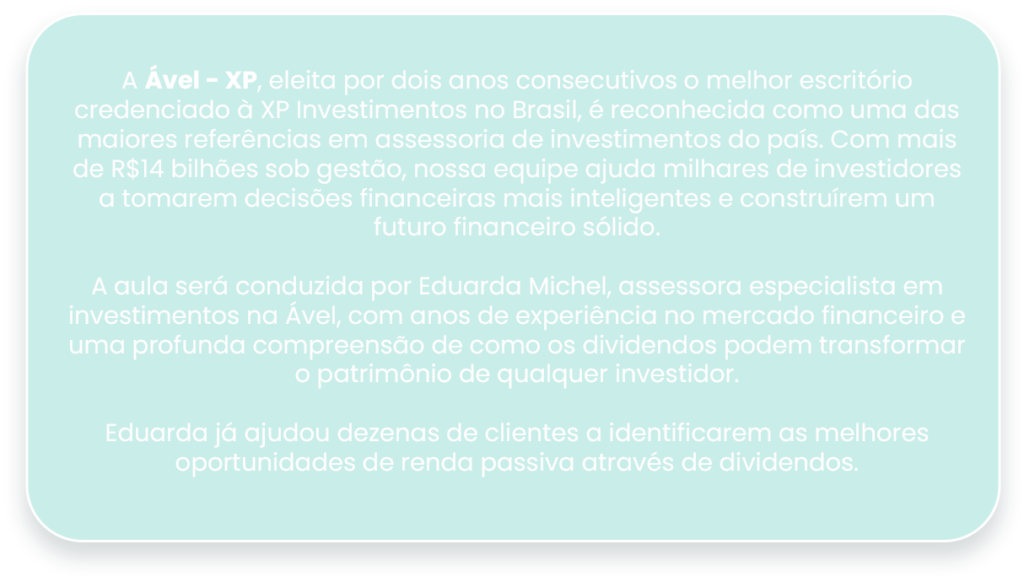 Você acaba de ganhar uma aula exclusiva sobre Como Construir Renda Passiva com Dividendos, com nossa especialista Eduarda Michel.