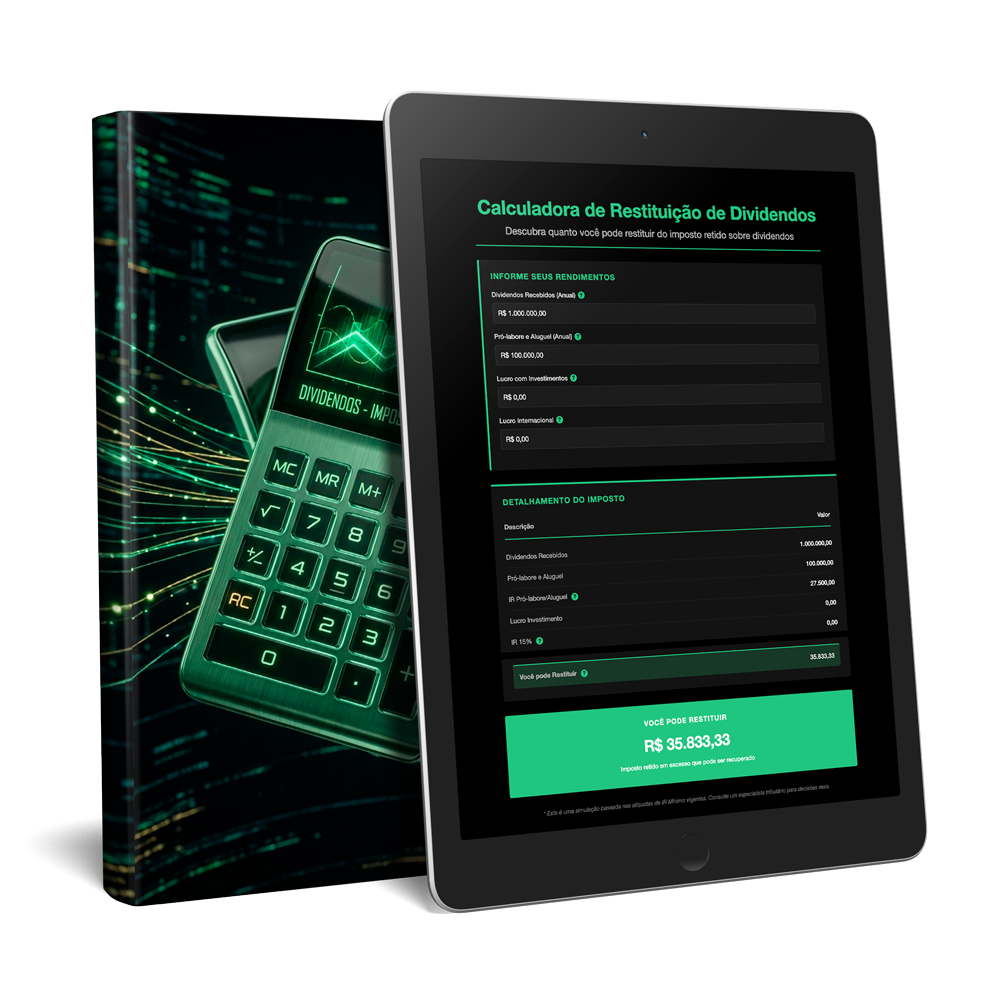 Disponibilizamos uma calculadora para você descobrir o quanto pode restituir de IR dos seus dividendos, segundo as novas regras impostas pela reforma tributária, vigente em 2026. Apenas insira os seus ganhos com dividendos, pro-labore, lucro com investimentos nacionais/internaiconais e veja na pratica a simulação dos impostos pagos a mais e valor a restituir.